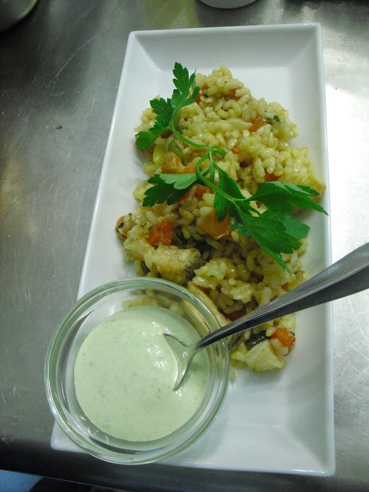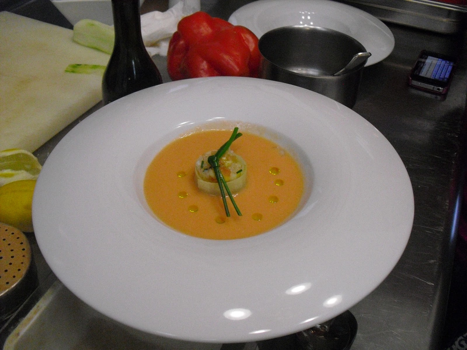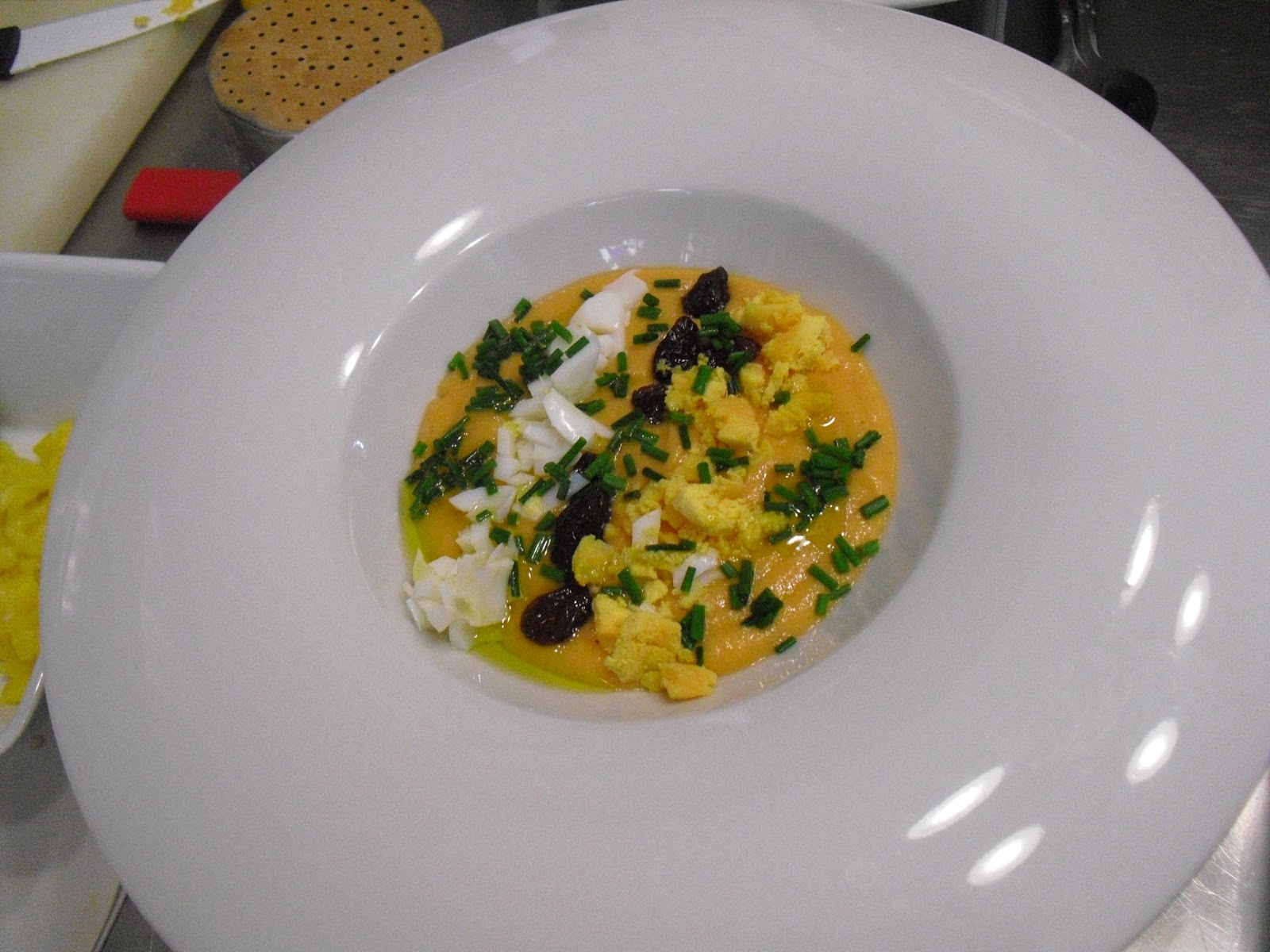 The photos below show the finished dishes. The first is gazpacho, which was served with  finely chopped prawn and mango encased in a thin sliver of cucumber. The second photos is of salmorejo with chopped up hard boiled egg, chives and raisins. This dish would normally have chopped up Iberian ham added to it as well, but the students didn’t want any. The third photo is the paella which was served with garlic and basil mayonnaise.  Lastly, there’s a photo of the “torrijas”.