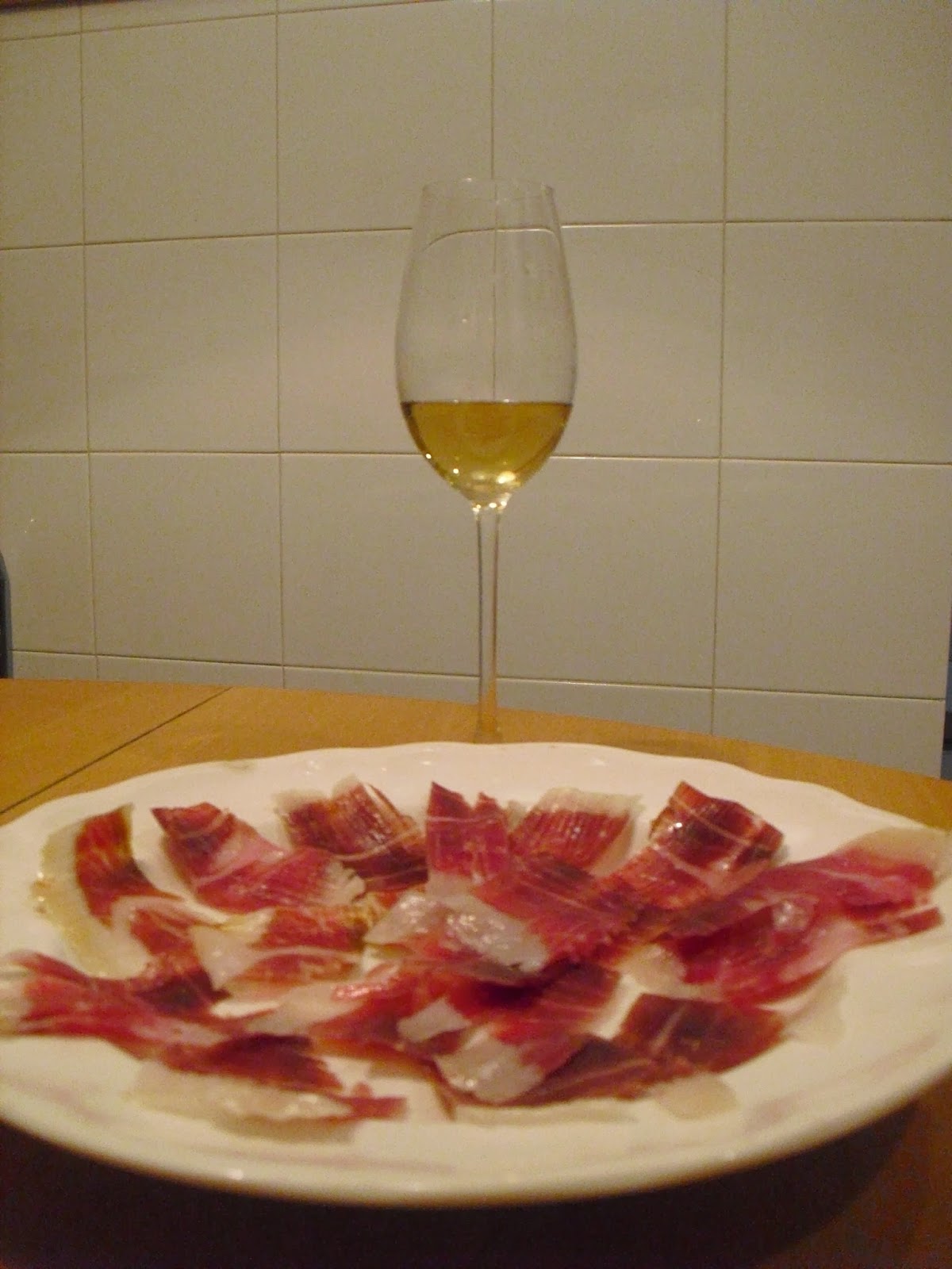 The nose on the fino is more intense than most with notes of almonds, baked apples and yeast. On the palate it is quite austere and has a very tangy and bitter finish of great intensity with all the aromas of the nose coming back with added notes of dried herbs. This is a very serious fino which cries out for food to accompany it. Having just bought an organic acorn-fed Iberian front leg or “paleta” a plate of this was the perfect match to go with the fino for myself and my wife.
