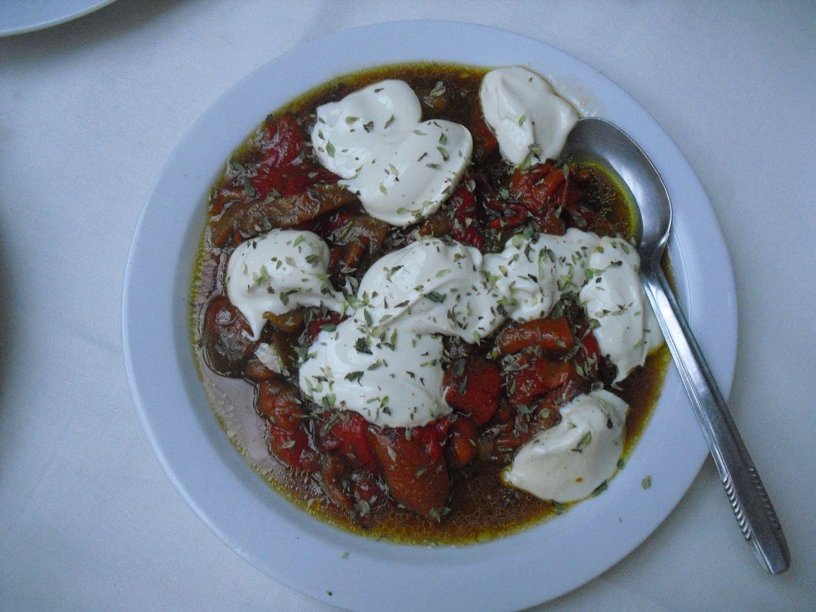 Next up was a salad of baked red peppers with goats’ milk cheese. This was another success with my friends from Hong Kong (photo below).