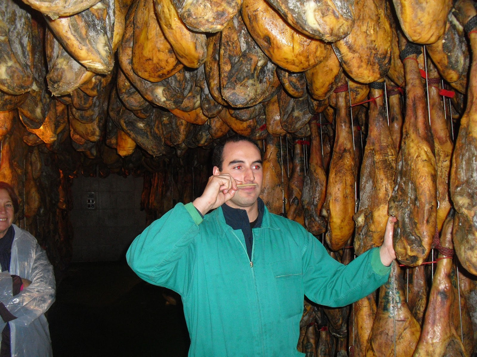 After the farm visit we headed on to Jabugo, the most famous town in Spain for Iberian ham. Gerardo, who over the years has become a very good friend of mine, showed us around the ham factory where he works. Before any ham leaves the curing cellars it is tested to see whether it is ready and also to see if it might have any defects, thus preventing it from being sold. The test involves using a implement which is traditionally made using bone from the femur of a cow and is called a “cala” in Spanish. It has a small handle which tapers into a long thin cylindrical part with a sharp point at the end. This is inserted into three points on the ham representing three different muscles. The part that has been inserted is then smelt. An experienced ham tester will then know from the aromas if the ham is ready, if it needs more curing time and if, in a worst case scenario, it is defective. The first photo below shows Gerardo inserting the “cala” and in the second he’s doing the smell or aroma test.