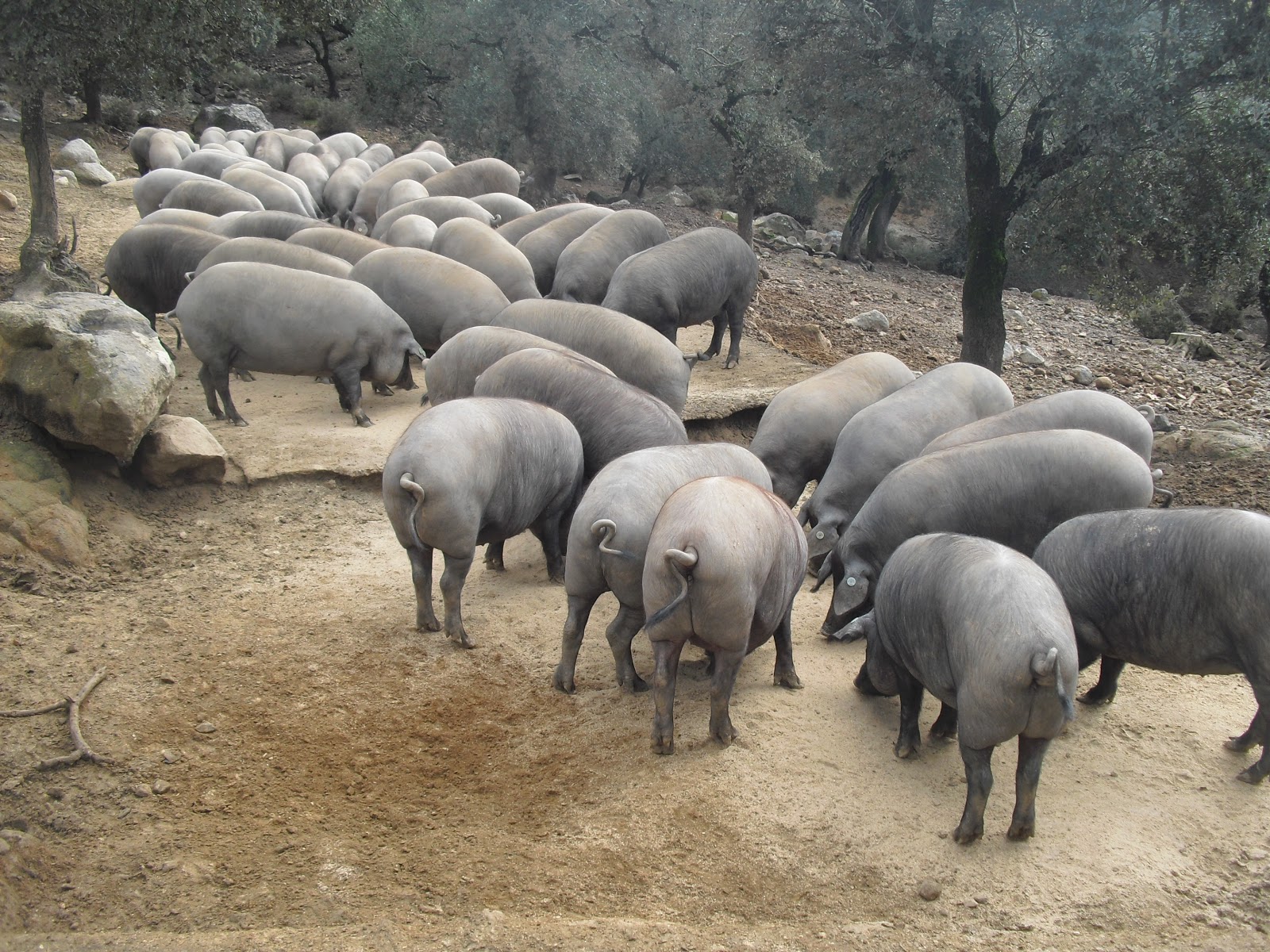 Yesterday (22 November), I took some people on my Iberian or iberico ham tour. The months of October and November are when the free-range Iberian pigs start eating acorns which they root around for among the holm oaks and cork oaks. The idea is that the pigs gain 50 to 60 kilos in weight from a diet based principally on acorns before they go on their final journey. The acorn diet is what gives the best Iberian ham its sweet nutty taste and its extra oil content. The hams from pigs at the farm that I go are destined for the highest classification within the Demoninación de Origen (D.O.) or appellation, Jamón de Huelva which is one of 4 Iberian ham D.O.’s in Spain. The pigs whose hams are destined for D.O. status are tagged before they start their acorn diet. The photo below shows the tag on the ear of a pig; it’s the lower one of the two tags. Click on the photo to enlarge the image so that you can see it properly