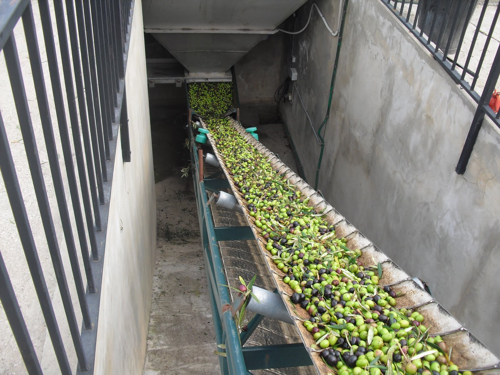 The second photo shows the oilves being taken along a convoyer belt. Before they reach the milling machine, leaves will be removed with a ventilator and the olives will be washed.