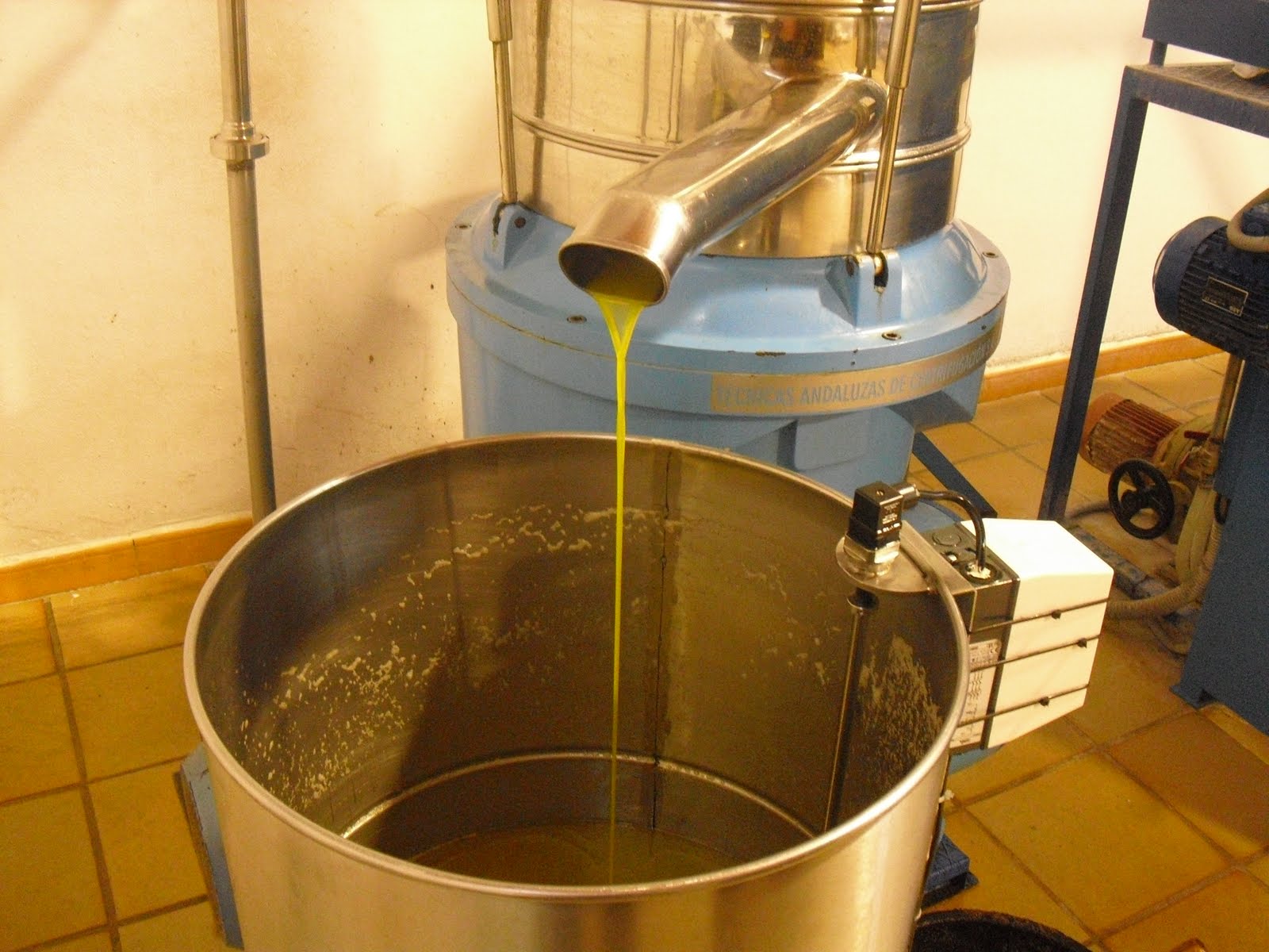 The paste goes into a horizontally-axised centrifuge which separates the solid from the liquid part; the liquid part comprises water and oil. These are separated using a vertically-axised centrufuge. In the photo below, you can see the oil coming out.