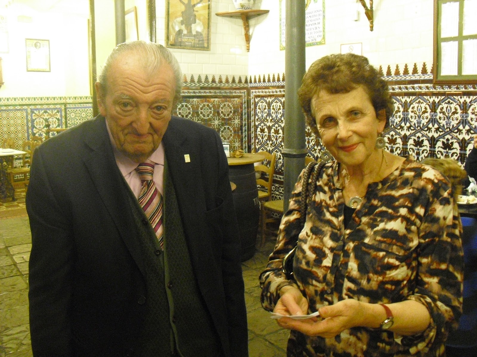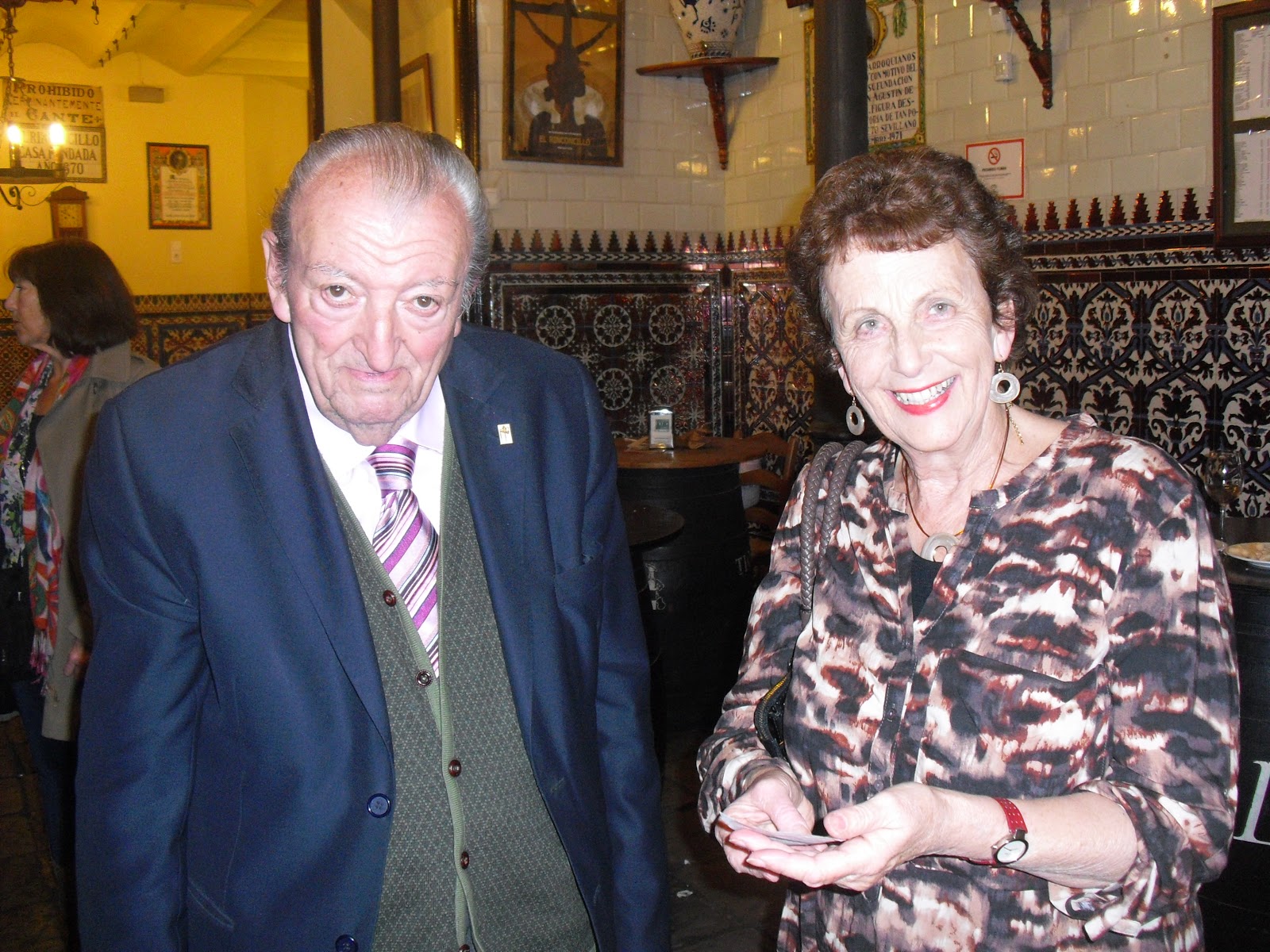 Last night I took an Australian couple on a tapas tour, visiting four bars and having different things in each place. In the first place that we went to, I normally see one of the regular customers, Valentín, a very active 84 year old. He is in the bar everyday at around 7 p.m. and then leaves at about 9 p.m. when his wife collects him. If he sees an attractive woman, he takes a paper serviette and writes a few lines of prose about her and hands it over. He often gets invited to a drink and if he’s lucky a kiss on either cheek. Below is a photo of him with one of my clients.