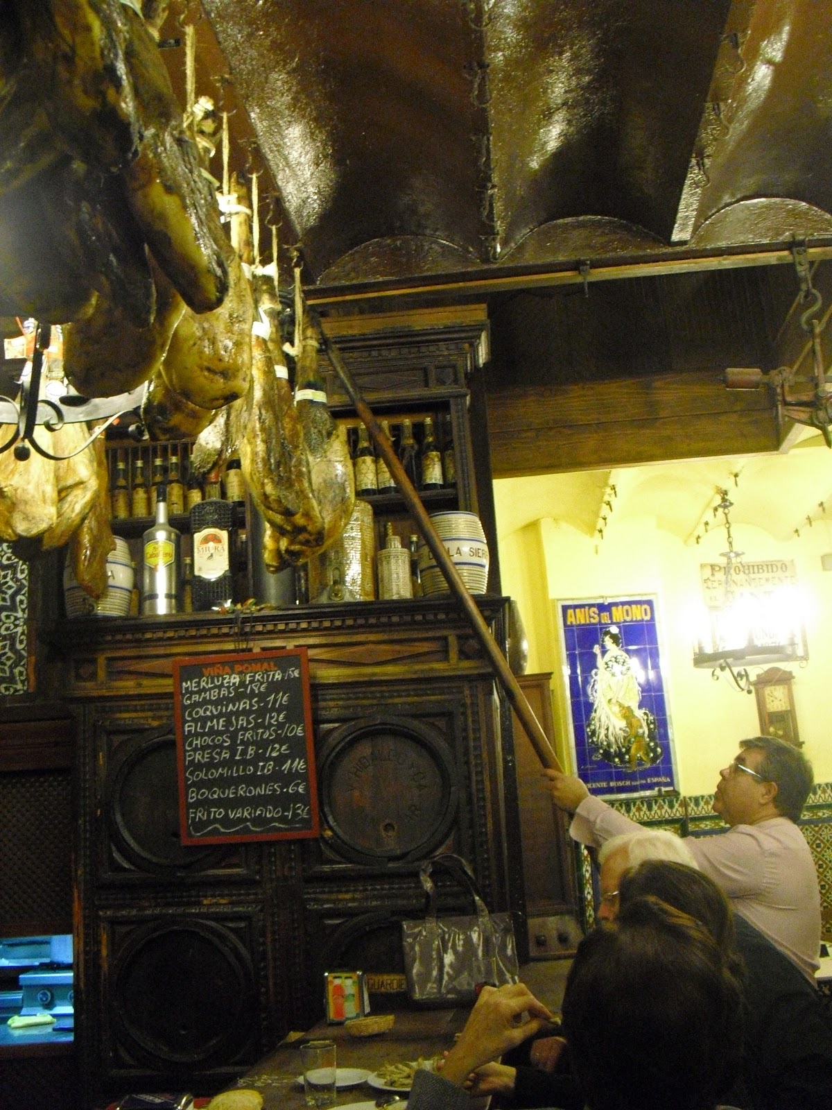 The next photo shows my friend Carlos, one of the owners at the same bar, taking down an acorn-fed Iberian ham. You probably know that these are the best hams that can be found anywhere. If you have looked at my website or at previous blog entries you probably know as well that my company, A Question of Taste, runs tours related to Iberian ham or as some people call it, iberico ham.