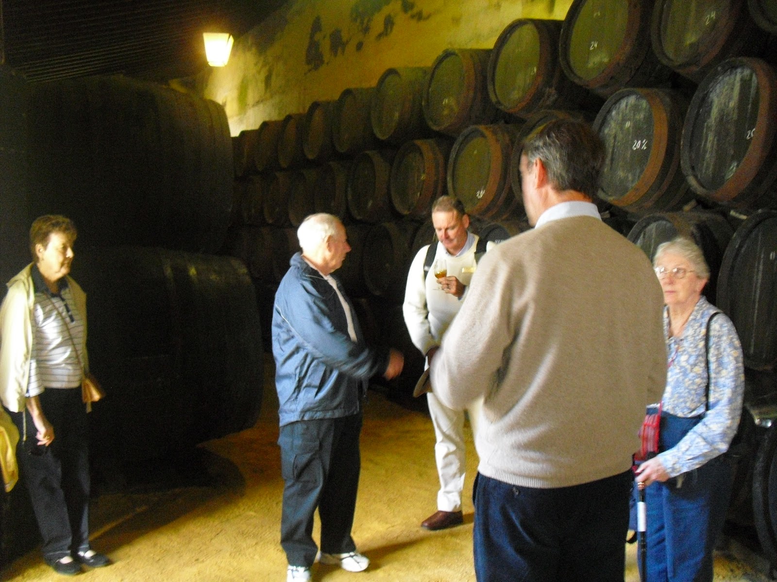 Like many sherry wineries, the one we visited has a glass-ended sherry butt to show the growth of yeast on the surface of fino sherry. The rainfall that we have had, has raised the humidity in the wineries. This together with the drop in temperature favours the growth of the yeast which is now quite a bit thicker than it was a few weeks ago. You can see the yeast layer in the photo below.