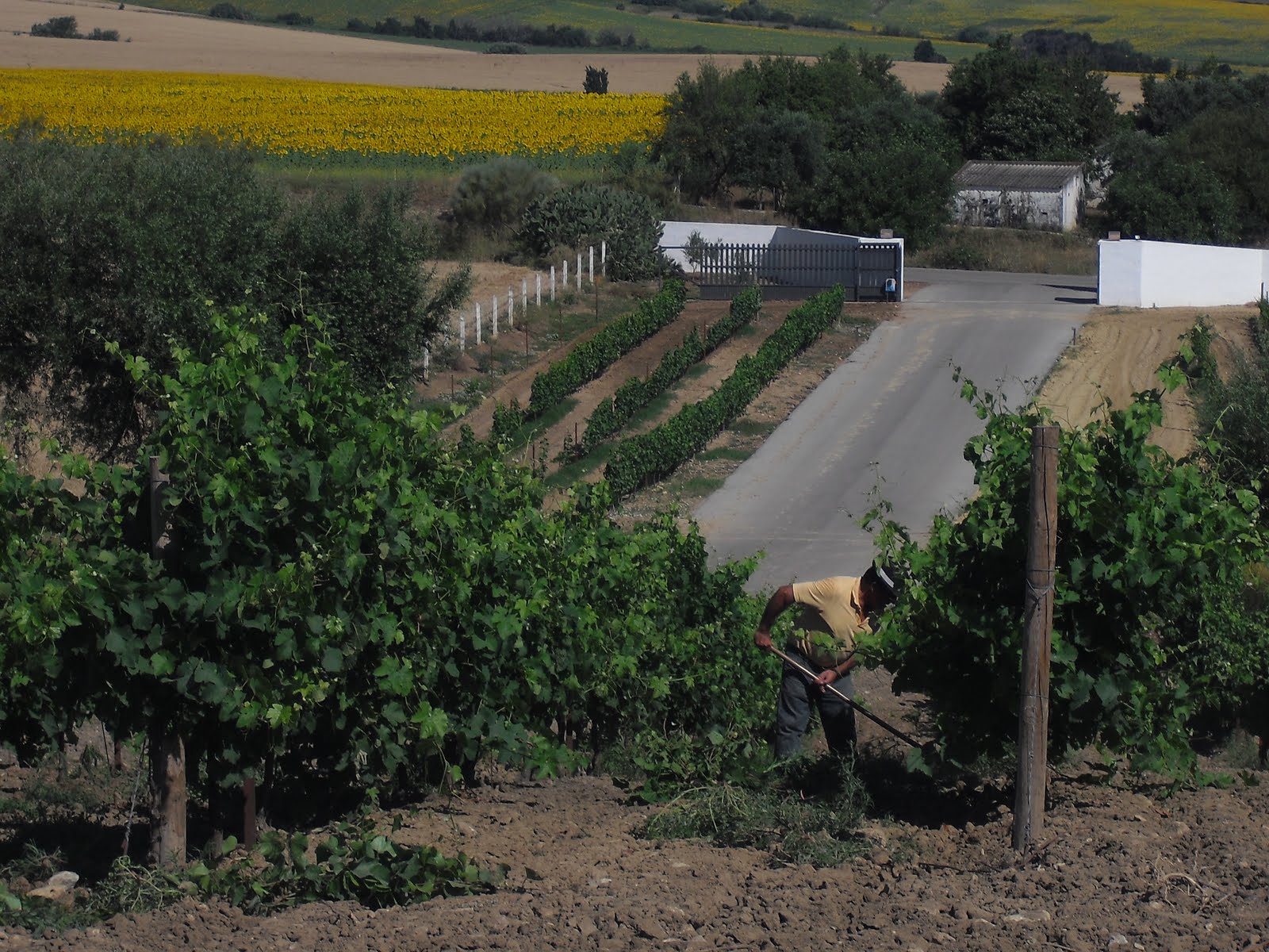 I thought that it was time to write up on the wine tour that I run to Arcos de la Frontera, especially as I have been there quite a few times recently; on Thursday (16th June) I took two Australian women there. The winery that I go to is to the east of Arcos and is in a wonderful setting. The main grape that they grow is Syrah, along with smaller quantities of Cabernet Sauvignon, Merlot and a local grape, Tintilla de Rota (related to the Graciano grape from La Rioja). In the first photo below you can see one of the vineyard workers doing some weeding.