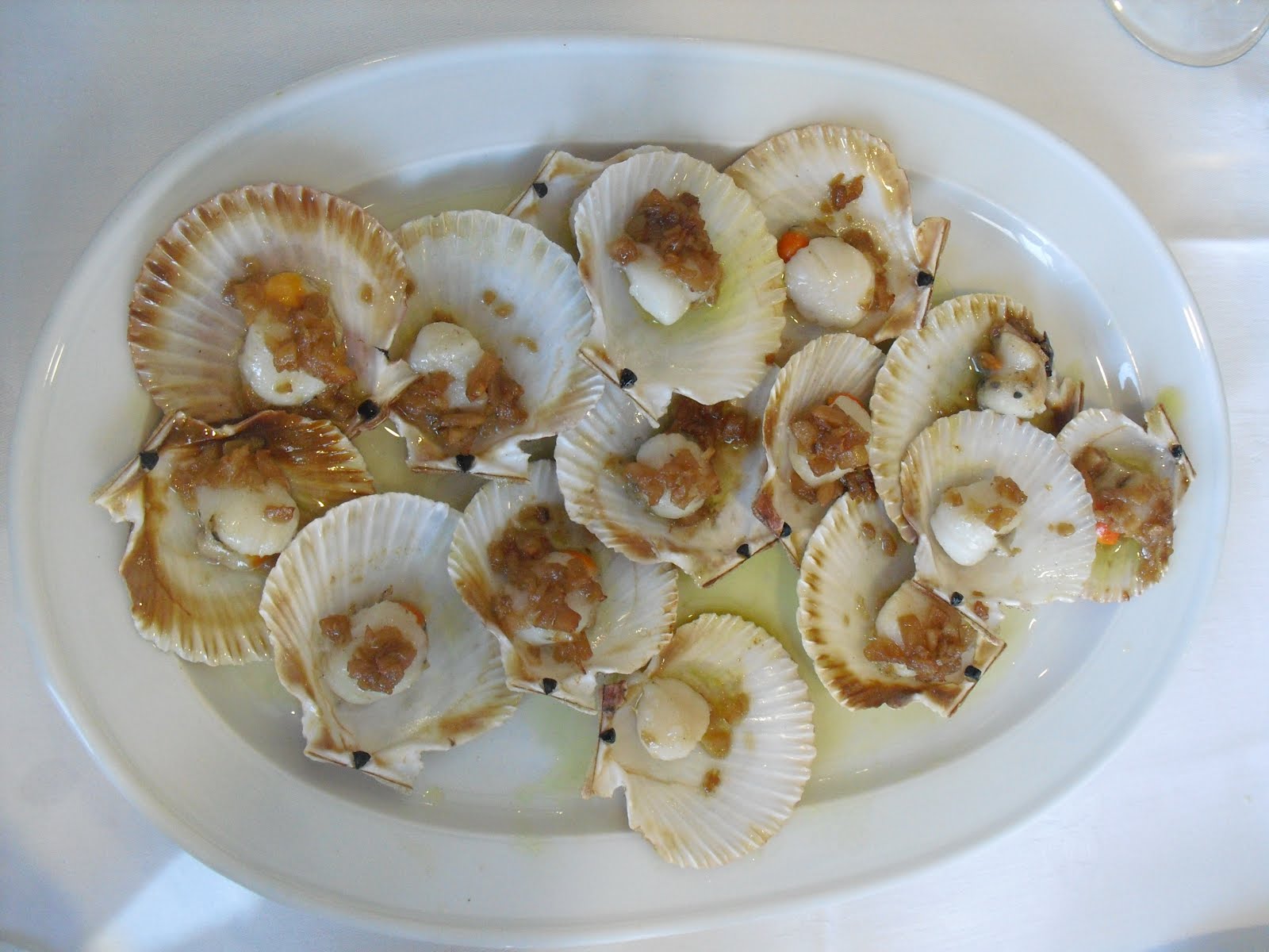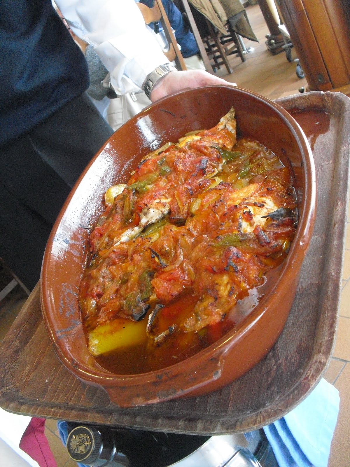 Among the dishes that we had were some small scallops, called “zamburiñas” in Spanish, and a sea bream that was baked in the oven with potatoes, tomatoes, peppers and onions. Photos of both are shown below. The food was accompanied by manzanilla ” en rama” which is unfiltered and comes directly from the sherry butt, just like the manzanilla we tried at the winery.
