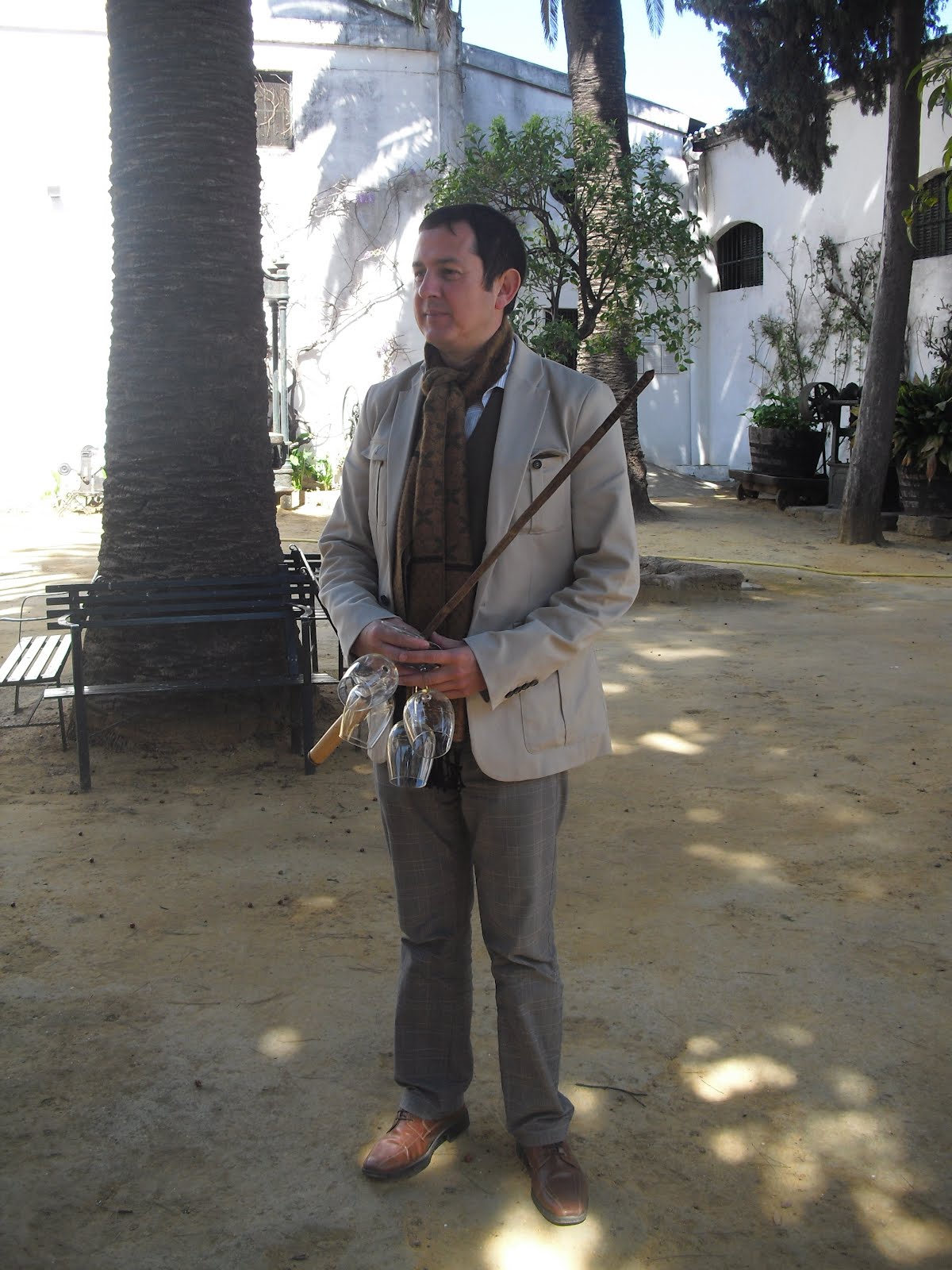 Leaving the market, we headed off to the winery where my friend Fernando was waiting to show us around. You can see him in the photo below with wine glasses and the cane for taking wine from the sherry butts at the ready.