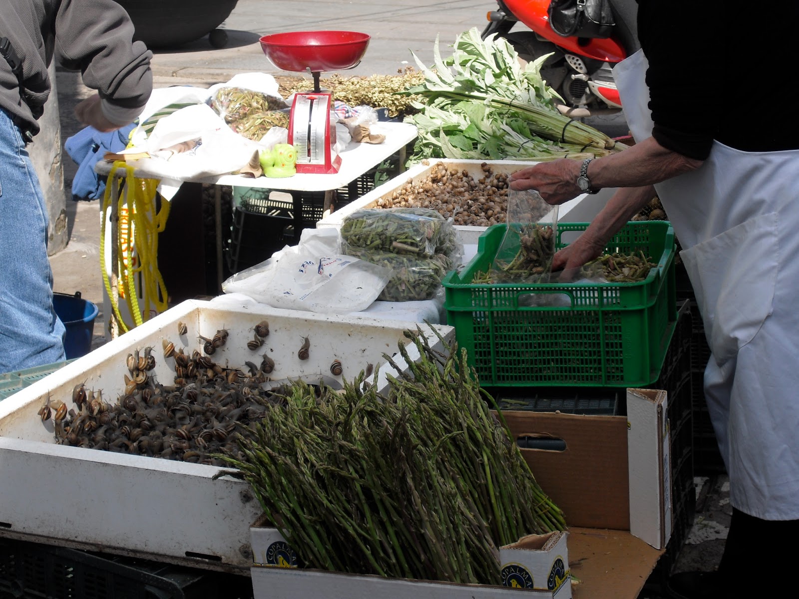 The next photo is of a stall oustide the market selling among other things, snails, wild asparagus and “tagarninas” known in English as Common Golden Thistle or Spanish Oyster thistle. The leaves of the thistle are peeled. The fleshy interior is used in stews, omlettes, croquettes, etc. In the photo they are in plastic bags.
